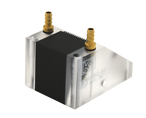 Призма наклонная для механизированного и автоматизированного УЗК, с твердосплавными вставками и штуцерами подачи акустической жидкости. Для поперечных волн, угол ввода центрального луча 55 град.