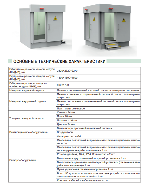 Модуль защитный «TISSA-RP» предназначен для защиты персонала от излучения, возникающего при рентгеновской дефектоскопии или иных технологических процессов. Оснащен двумя защитными дверями, штативом для позиционирования рентген аппарата, выдвижным столом для объекта контроля. Модуль представляет собой систему сборных конструкций, что позволяет осуществлять доставку элементов конструкции и монтаж изделия без работ по перепланировке помещения, демонтажа стен, расширения оконных и дверных проемов. В состав конструкций модуля входят: несущий каркас; комплект экранов защитных; комплект устройства наружной отделки; комплект устройства внутренней отделки; ворота защитные; комплект вентиляционного оборудования; комплект электрооборудования.