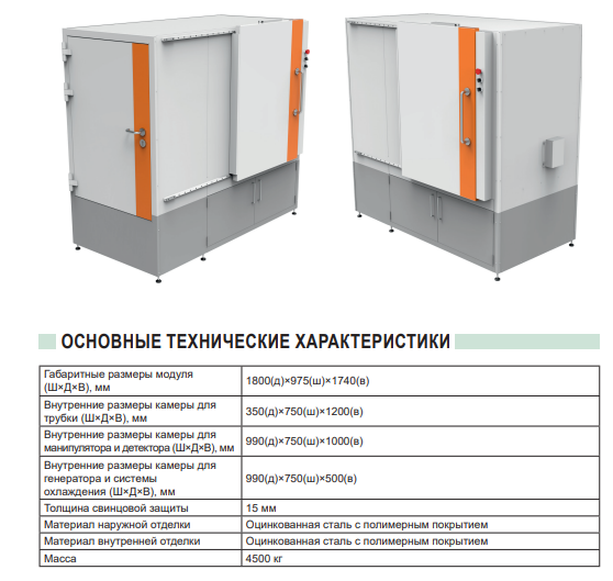Модуль защитный «TISSA-RP» предназначен для защиты персонала от радиационного излучения, возникающего в ходе технологических процессов. Модуль защитный состоит из трёх камер: камера для манипулятора и детектора; камера для рентгеновской трубки; камера для генератора и системы охлаждения. Конструкция модуля обеспечивает непрерывность защиты от радиационного излучения по всей внешней поверхности модуля. В качестве защиты применяются свинцовые панели. Для прохождения высоковольтного кабеля и шлангов системы охлаждения предусмотрен защитный лабиринт. На каждой двери установлены два дублированных датчика, блокирующих включение трубки при открытии двери. Камера для манипулятора и детектора оборудована светильником обеспечивающим освещенность рабочей зоны 400 лк.
